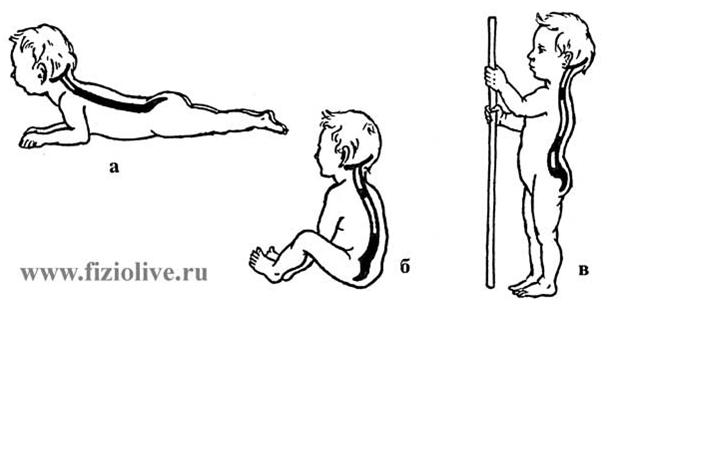 Появление изгибов позвоночника у детей в связи с держанием головы (а), при сидении (б) и стоянии (в)
