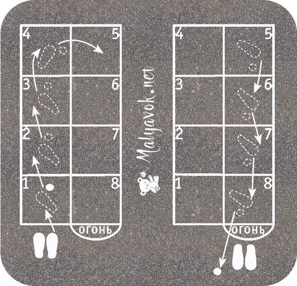 На асфальте нарисуйте прямоугольник размером, примерно 1м х 2м. Затем, в прямоугольнике расчертите «классы» — их может быть 8 или 10. У вас получится прямоугольник с двумя рядами по 4 или 5 клеточек соответственно (рис. 1). Нумерация начинается с левой нижней клеточки (класса) до левой верхней и продолжается с правого верхнего до правого нижнего класса. Если хотите усложнить игру – добавьте клетку «огонь». Если бита случайно попадет в нее, то все достижения «сгорят» и придется начать игру с самого начала.