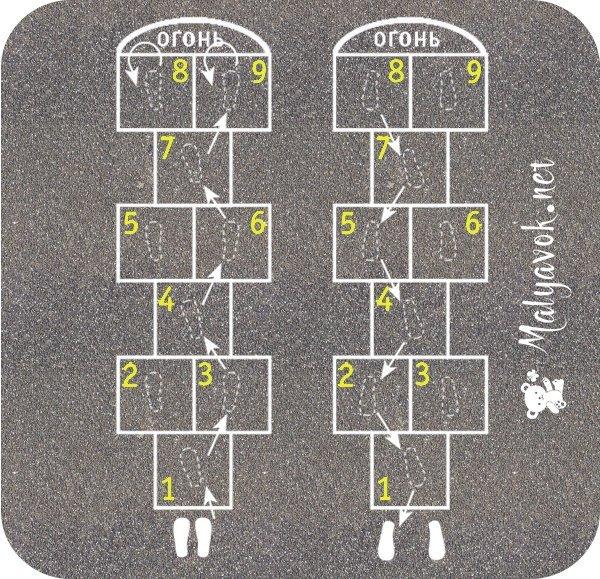 В шахматных «классиках» прыгают попеременно одной и двумя ногами — одна, две, одна, две, одна, две, поворот и обратно. Для этого, на асфальте необходимо начертить соответствующее поле из квадратов так, как показано на рисунке выше. Количество квадратов не ограничено, но чаще всего их 9-10 штук. На рисунке изображено девять квадратов, еще один можно нарисовать дополнительно перед первым, тогда получится следующая структура — один, один, два, один, два, один,два — всего 10.