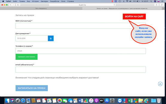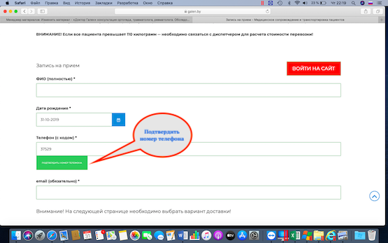 Далее -- необходимо заполнить ФИО пациента и его телефон (или телефон родственника, доступного для контакта с выездной бригадой!), если Вы впервые вводите данный номер телефона (он не зарегистрирован в системе) - необходимо будет подтвердить номер телефона путем введения кода, присланного в СМС сообщении. Если Вы ранее использовали сервис онлайн-бронирования транспортировки пациентов (или проводили запись к врачам центра через сайт - необходимо войти на сайт под своим логином и паролем).